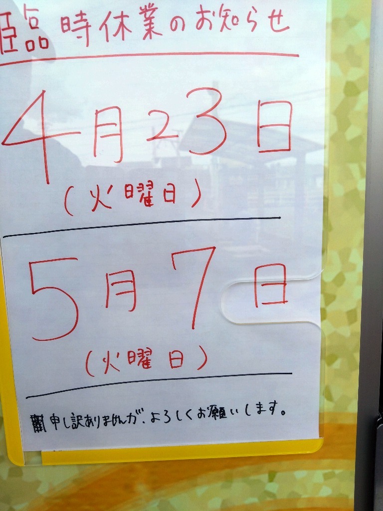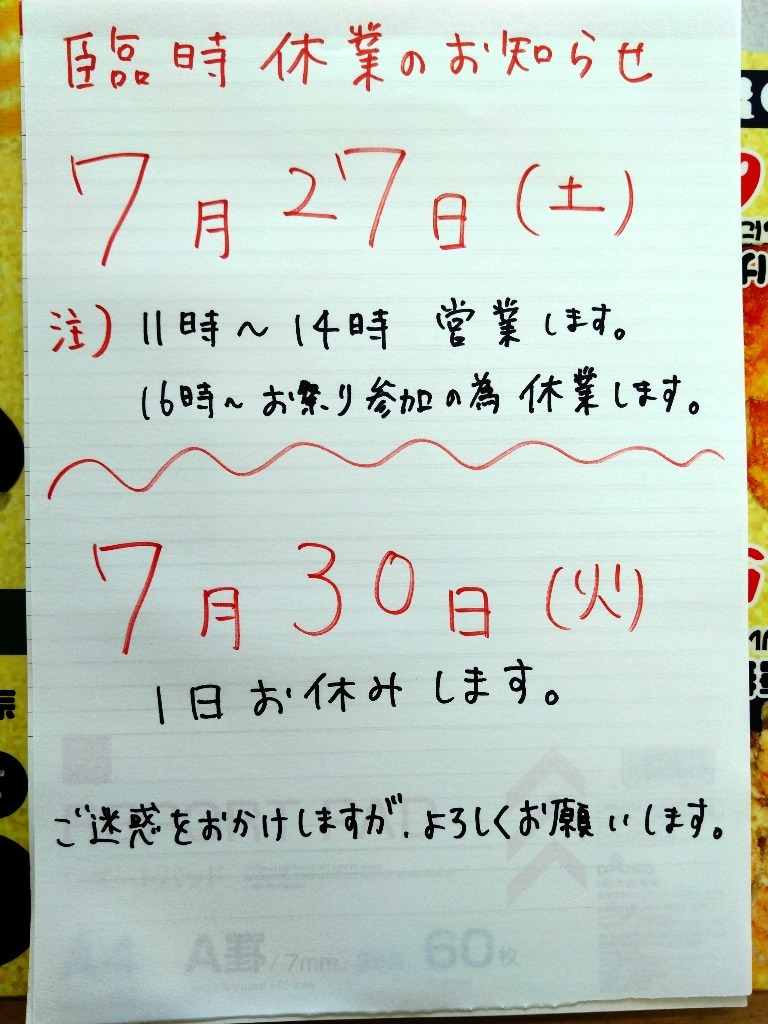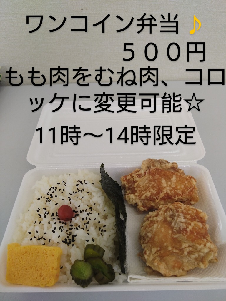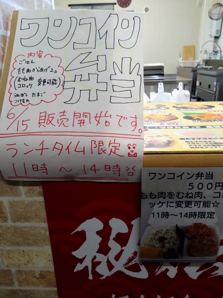 2024/08/01 新着情報 急で申し訳ありません。8月2日金曜日18:00閉店です。ご迷惑おかけしますが、よろしくお願いします。 2024/07/01 お休みのお知らせ 7/27土曜日11時〜14時 営業16時〜 休業7/30火曜日1日お休みします。ご迷惑おかけしますが、よろしくお願いします。 2024/06/10 ワンコイン弁当🍱 6月15日販売開始です。よろしくお願いします。 2024/05/13 期間限定商品 梅マヨネーズもも肉 3個 470円ヤンニョムチキン風もも肉 3個 470円6月30日までです。ぜひお試しください♪ 2024/04/04 お休みのお知らせ 4月23日(火)5月7日(火)お休みします。ご迷惑おかけしますが、よろしくお願いします。 PREV 3 4 5 NEXT